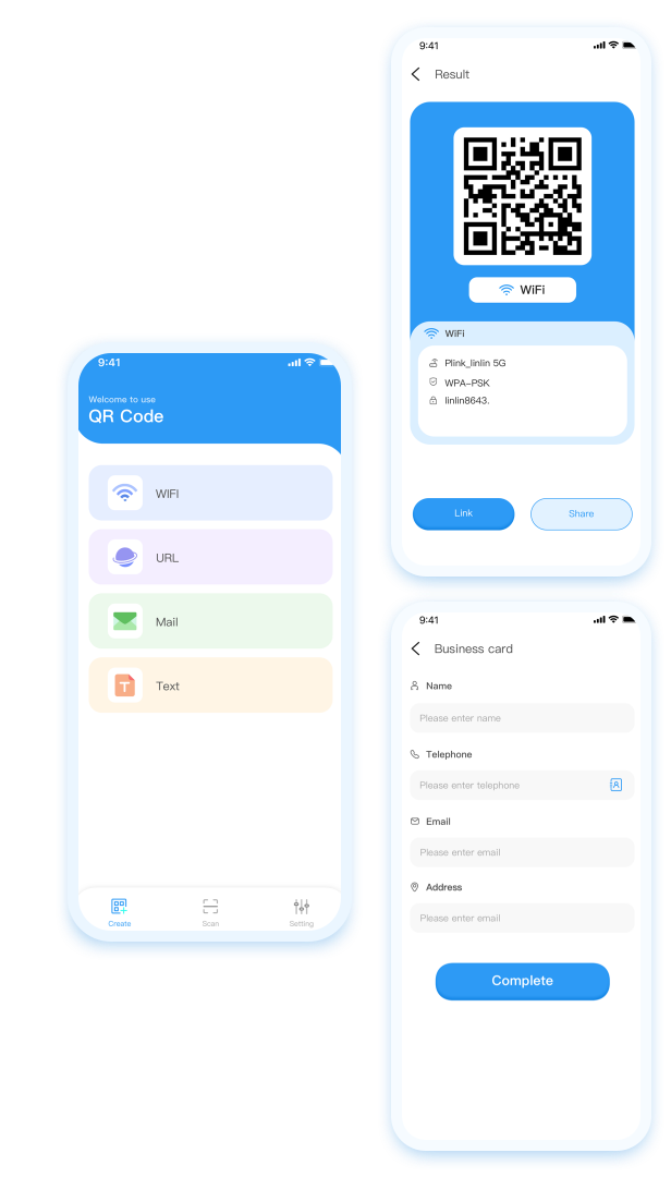 Here you can create users own exclusive QR code and scan QR code and share friends unlimited.